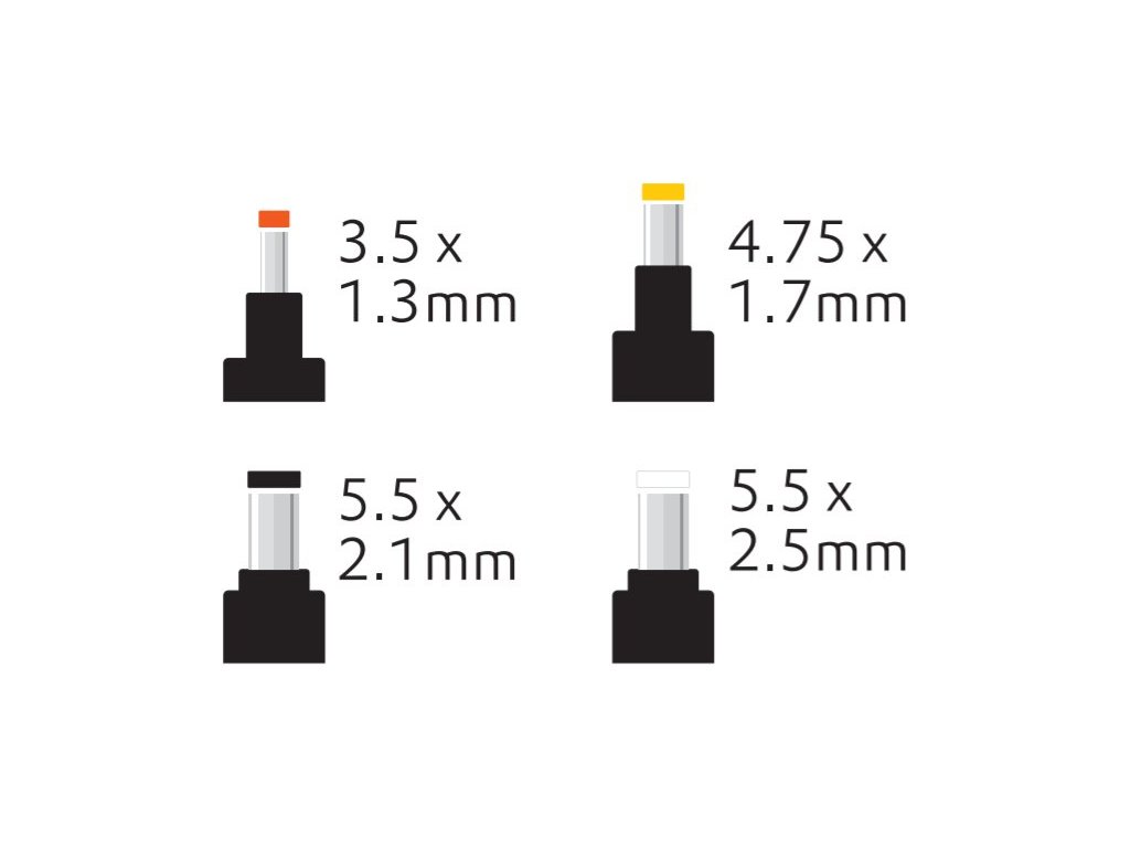 Výstupní zásuvky/konektory: 5,5 × 2,5 mm; 5,5 × 2,1 mm; 4,75 × 1,7 mm; 3,5 × 1,35 mm