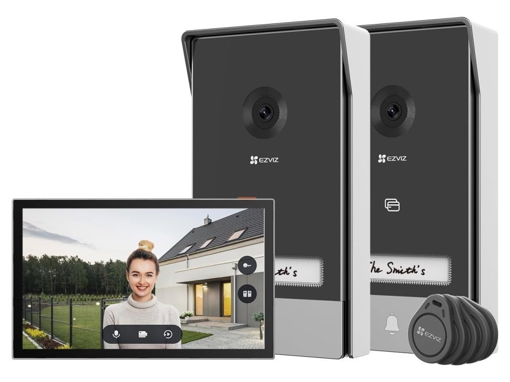 Súprava EZVIZ HP7 s 2 vstupmiSúprava dvoch dverových staníc (interkomov) s čítačkou čipov RFID, 7" monitorom pre domácnosti a príslušenstvom.