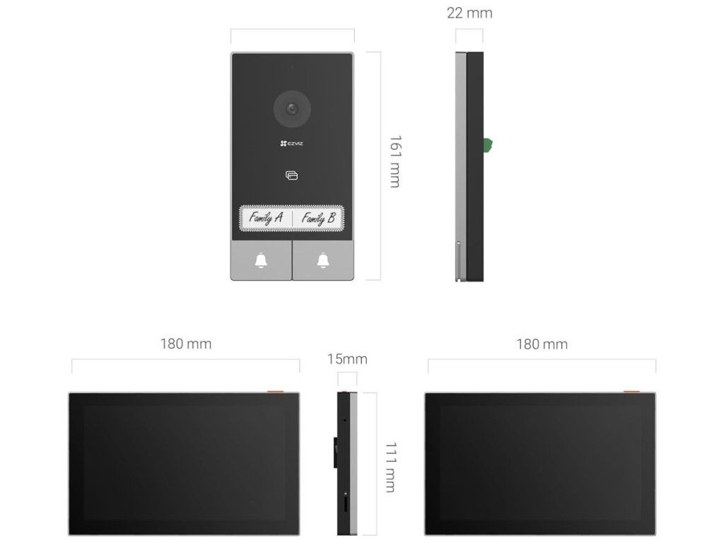 Dveřní stanice je vybavena dvěma zvonky a kamerou s rozlišením 2048 × 1296 px. Úhel záběru kamery je 162° diagonálně. Pro přenos obrazu je používán kodek H.265. Samozřejmostí je integrovaný mikrofon, reproduktor a čtečka přístupových čipů RFID. Připojení zvonku je realizováno 2drátově. Dotykový 7" monitor lze připojit pomocí Wi-Fi a disponuje microSD slotem. Vzdálené ovládání přes aplikaci, povrchová montáž, odolnost vůči nepříznivým vlivům dle certifikace IP65. Z chytrých funkcí je k dispozici například detekce lidské postavy, možnost vygenerování dočasného návštěvnického kódu či volitelná funkce změny hlasu pro zachování soukromí při komunikaci.