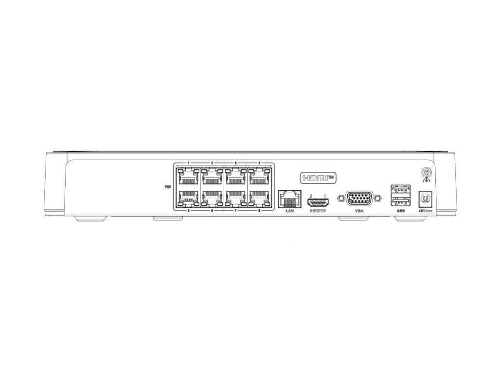 Porty: 1× HDMI Full HD výstup, 1× VGA Full HD výstup, 2× USB 2.0, 1× RJ-45 (10/100 Mbps), 8× RJ-45 (PoE podpora)