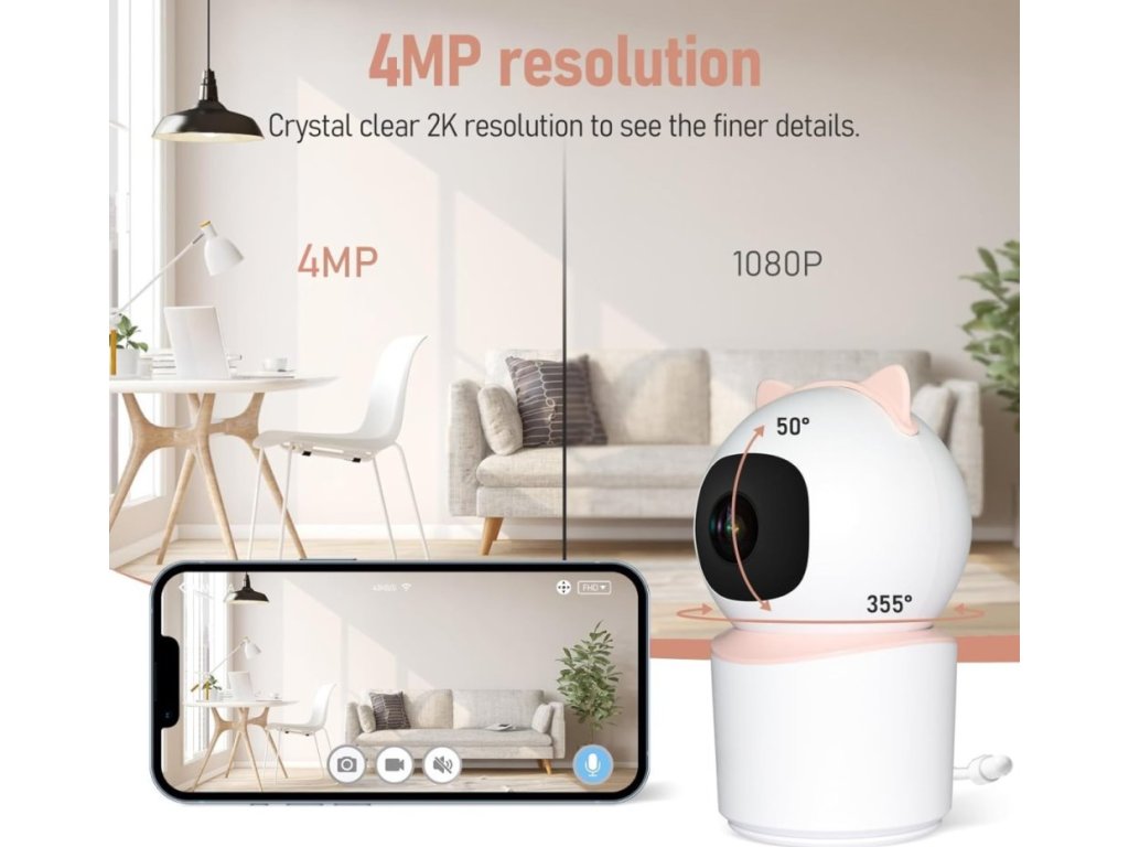 Chytrá vnitřní bezpečnostní kamera do dětského pokoje disponuje otočným mechanismem pro monitorování v zorném úhlu 360°. Snímač nabízí rozlišení 4 Mpx a je schopný snímat video v rozlišení 2560 × 1440 bodů. Pro případ zhoršených světelných podmínek je přítomen IR přísvit do vzdálenosti až 5 m. Součástí kamery je integrovaný reproduktor a mikrofon, který umožní kvalitní oboustrannou komunikaci. Připojení lze jednoduše realizovat bezdrátově skrze Wi-Fi. Propojení kamery pomocí aplikace v mobilním zařízení umožní pohodlný vzdálený přístup, ovládání kamery, pořizování záznamů či fotografií. Natočené záznamy je možné ukládat i na microSD kartu do kapacity až 128 GB. Mezi další užitečné funkce patří například detekce pláče, integrovaný teploměr a vlhkoměr nebo přehrávání pěti různých ukolebávek. Je také kompatibilní s inteligentními hlasovými asistenty Amazon Alexa, Google Assistant a Apple Siri.