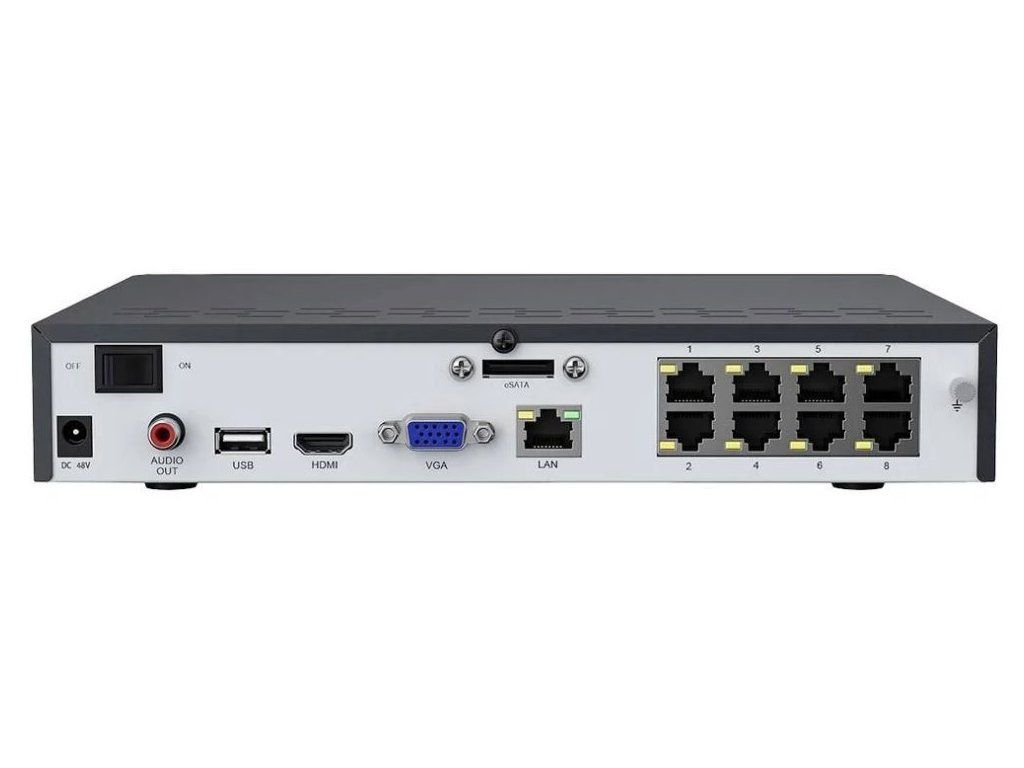 Porty: 1× HDMI 4K výstup, 1× VGA Full HD výstup, 2× USB 2.0, 1× RJ-45 (10/100 Mbps), 8× RJ-45 (PoE podpora), 1× audio výstup (RCA), 1× eSATA