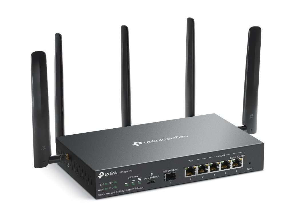 TP-Link ER706W-4G Omada VPN Router, 1x Nano SIM slot (4G+ Cat6), WiFi 6 2402 Mbps 5GHz + 574 Mbps 2,4GHz, 1x SFP GWAN/