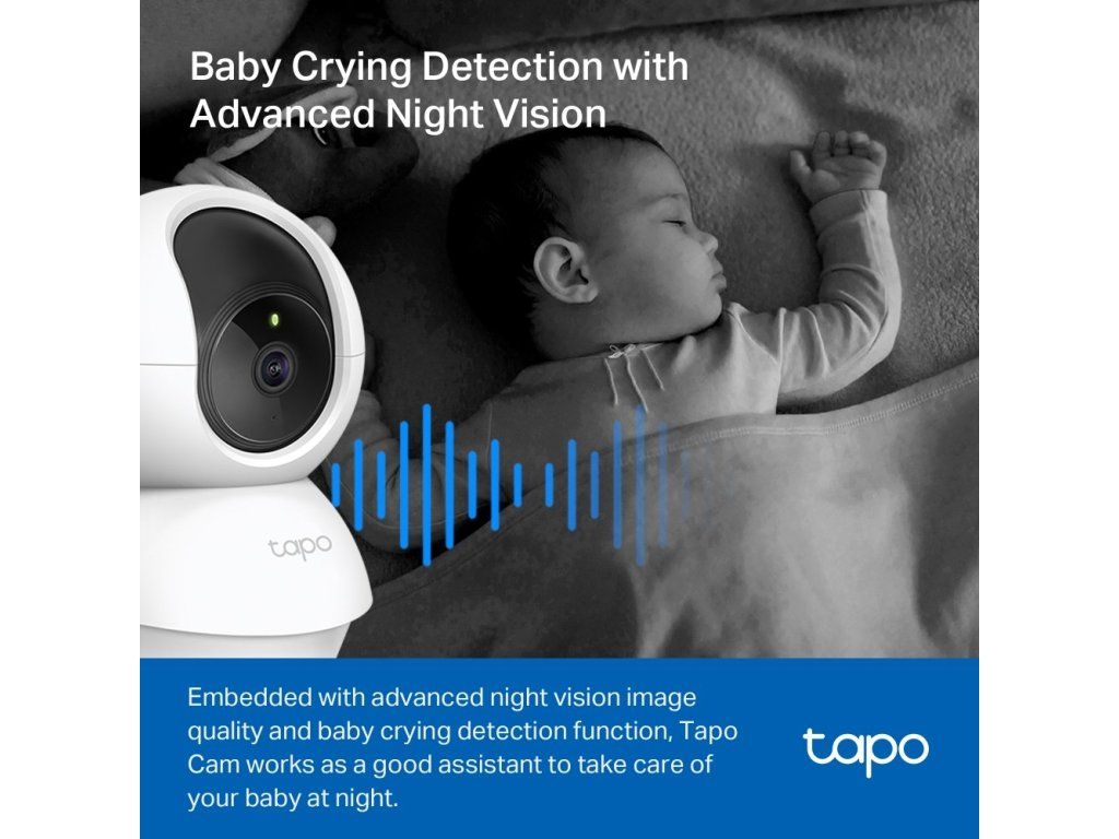 Tapo kamera, vybavená pokročilým nočním viděním a detekcí pláče miminka, posiluje péči o vaše dítě nepřetržitě.
