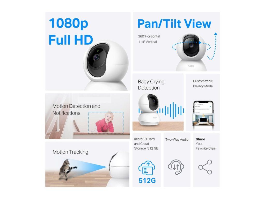 Inteligentní Wi-Fi bezpečnostní kamera s otáčením 360° a nakláněním 114°. Full HD 1080p rozlišení, noční vidění do 9 m, detekce pohybu a pláče dětí, obousměrné audio, lokální úložiště až 512 GB microSD.
