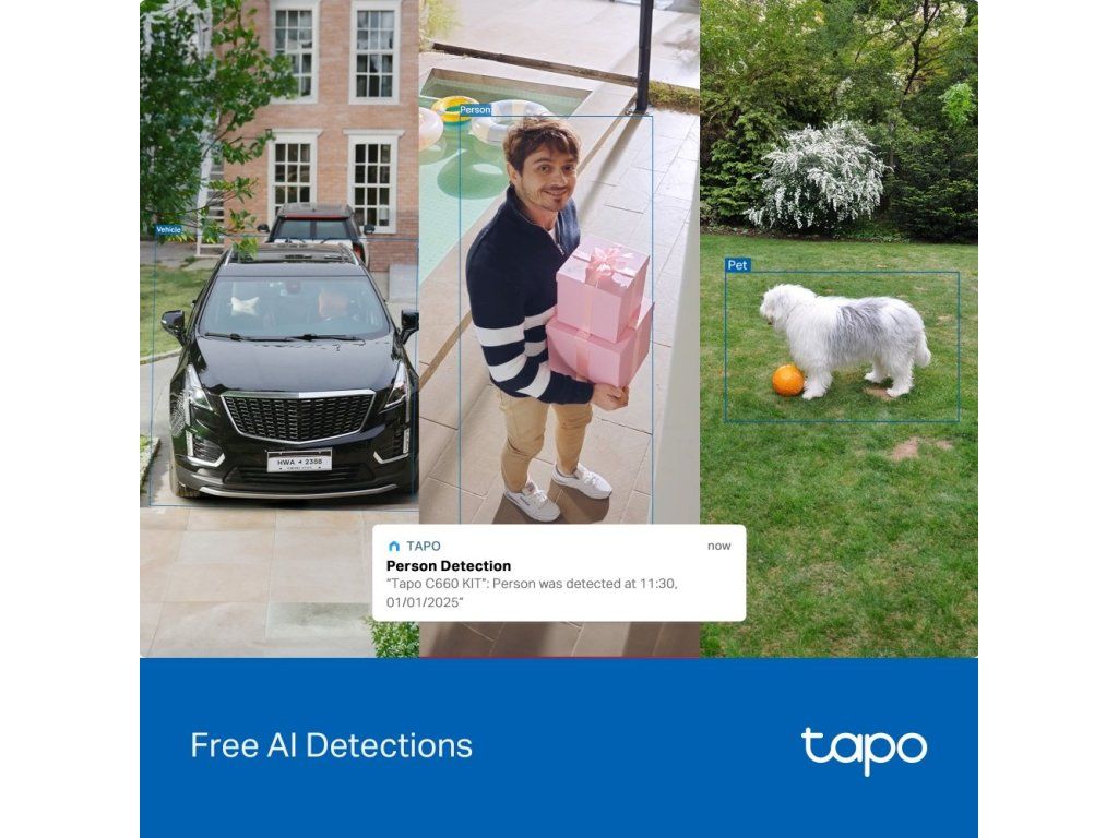 - Inteligentní AI detekce s rozpoznáváním osob, zvířat a vozidel