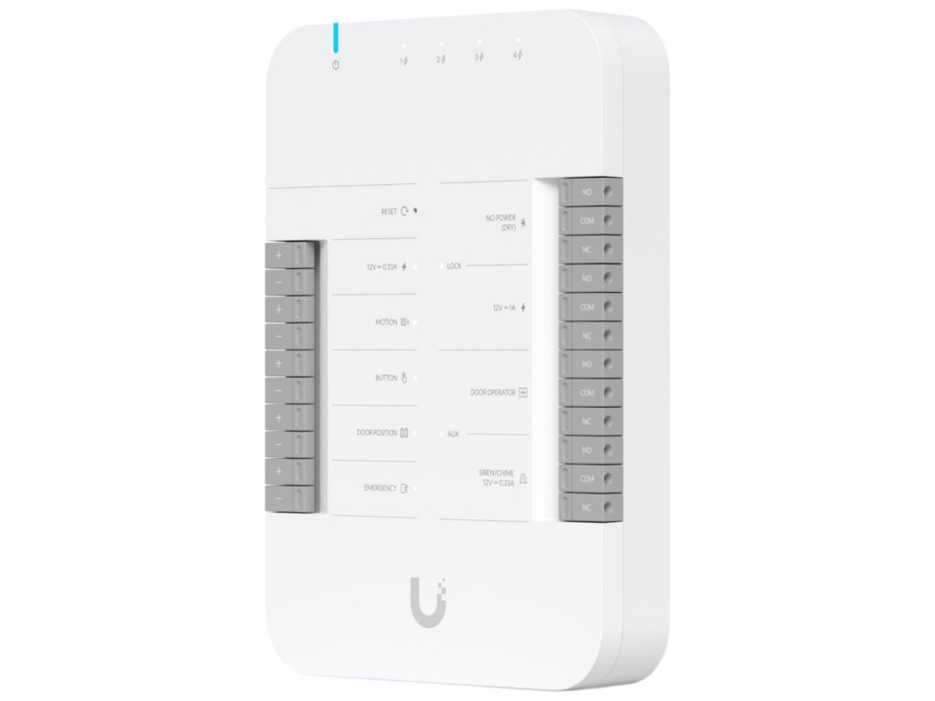 Rozbočovač Ubiquiti UniFi Access Door HubUniFi Access Door Hub je inteligentný jednodverový IP kontrolér, ktorý je súčasťou rodiny UniFi Access. Univerzálne rozhranie podporuje väčšinu elektronických a magnetických zámkov a je kompatibilné s 12 V príslušenstvom (tlačidlá, alarmy, snímače pohybu atď.) Spĺňa certifikáty CE, FCC, IC, UL 294 a CAN/ULC-60839-11-1 (trieda 1).