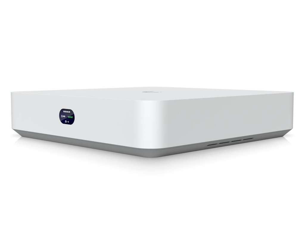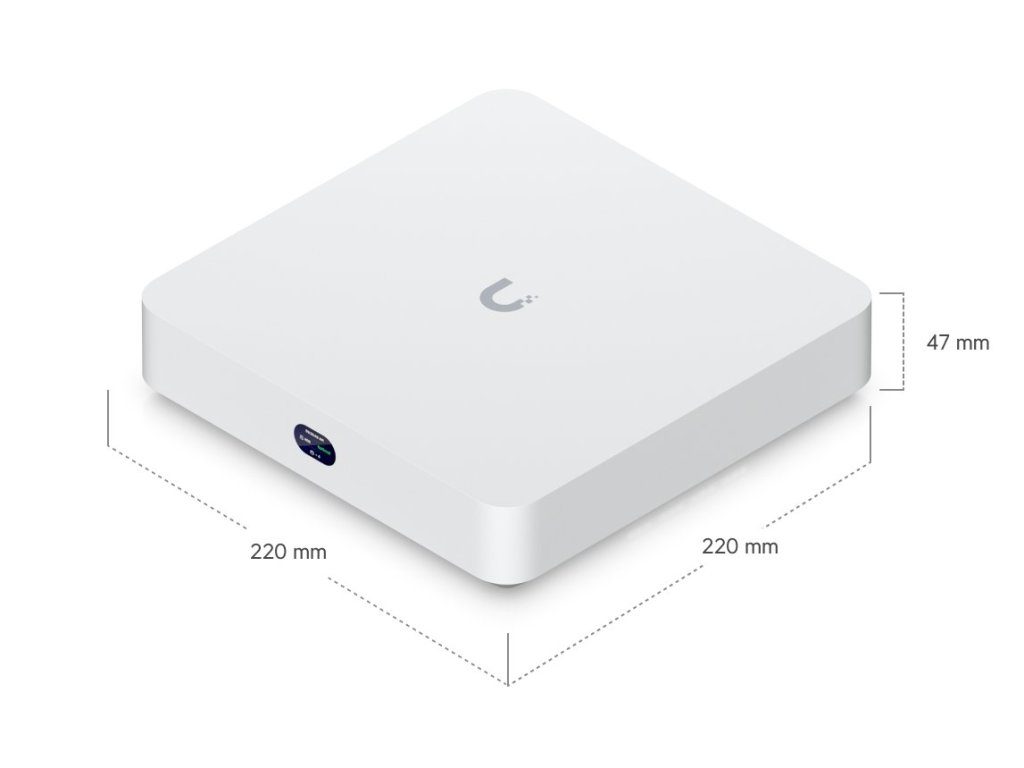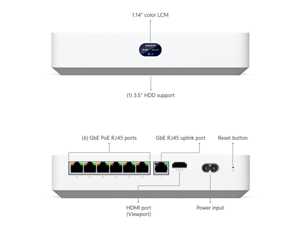 Zařízení je vybaveno výkonným quad-core ARM Cortex-A55 procesorem (1.7 GHz), 4 GB operační pamětí a slotem pro jeden 3.5" HDD disk. Kompaktní provedení 220 × 220 × 47 mm umožňuje instalaci na stěnu nebo na DIN lištu. Pro připojení ke kamerové síti vyžaduje UniFi Gateway nebo Layer 3 switch pro přidělování IP adres.