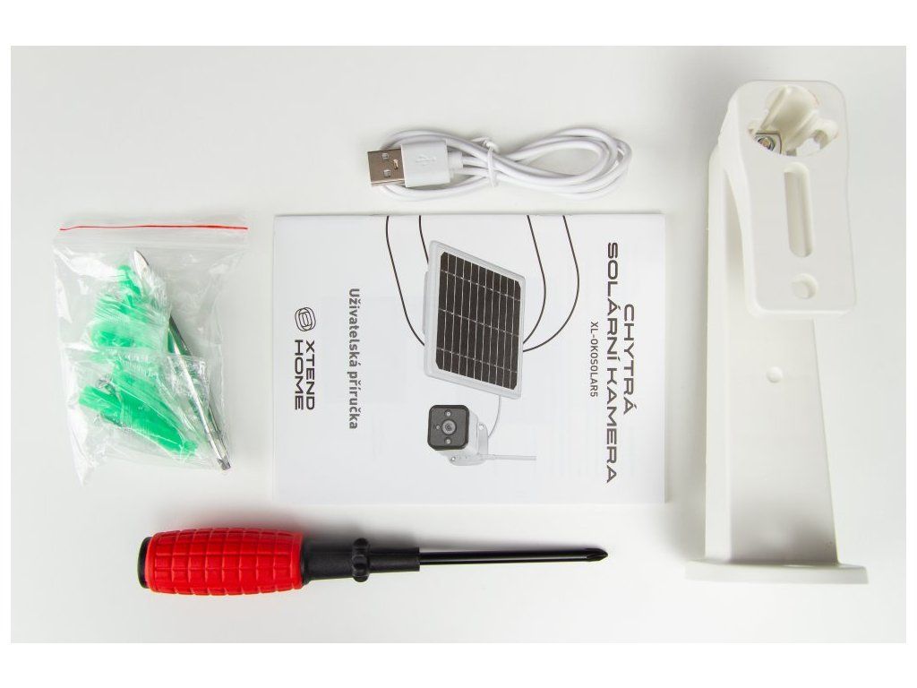 Obsah balení: kamera, Wi-Fi anténa, solární panel s vloženými bateriemi, propojovací kabel, micro USB kabel, stojan na panel, spojovací materiál, pinzeta, šroubovák, uživatelská příručka