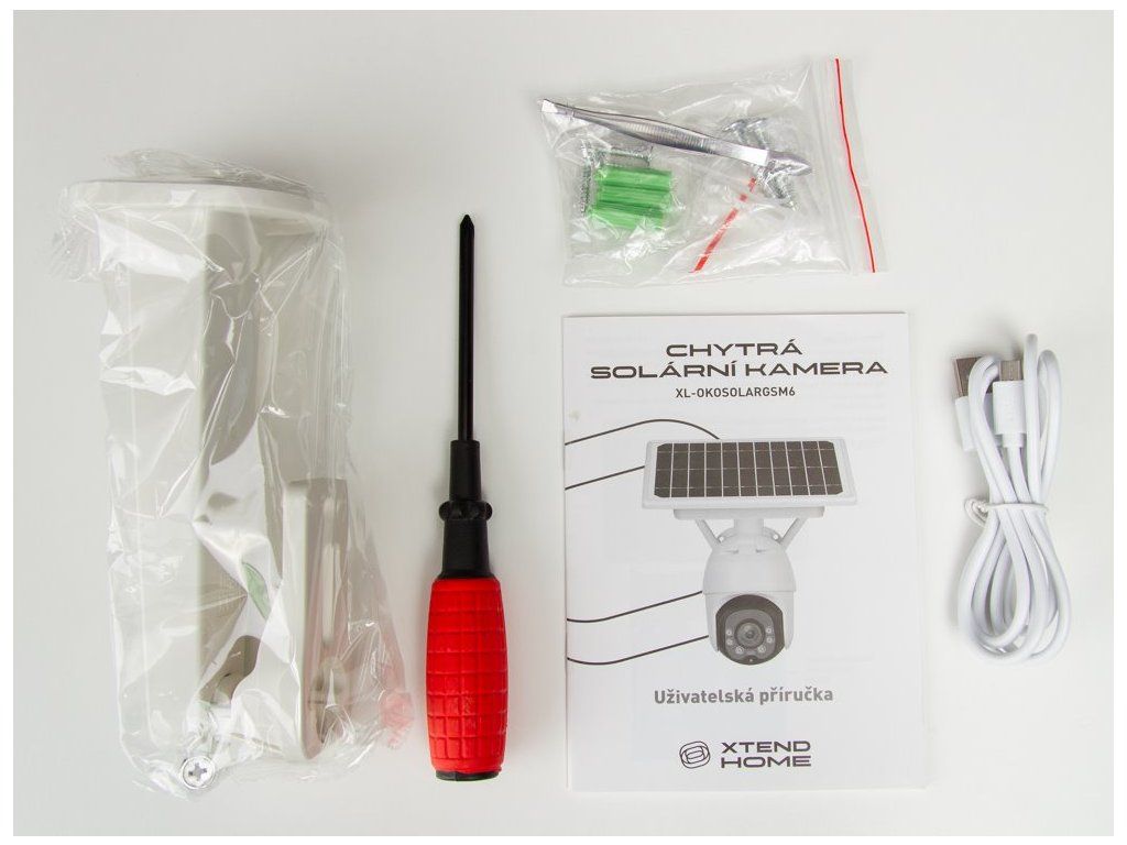 Obsah balení: kamera, solární panel s vloženými bateriemi, propojovací kabely, micro USB kabel, stojan na panel, spojovací materiál, pinzeta, uživatelská příručka