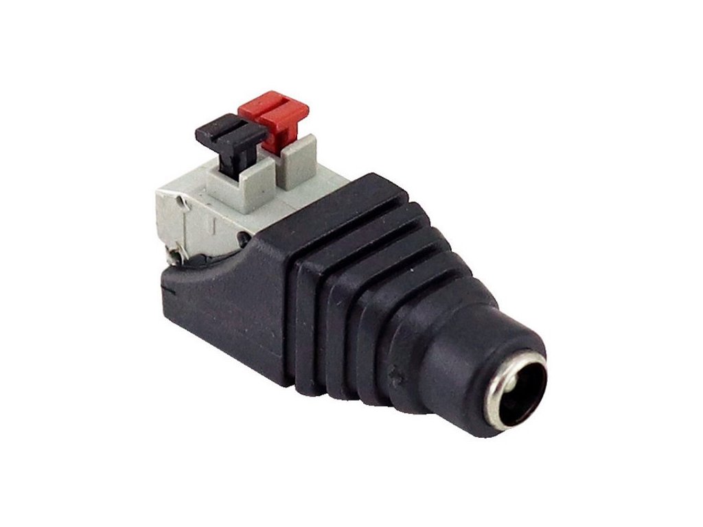 Redukce z 2pólové pružinové svorkovnice na napájecí zásuvku (plug) 5,5 × 2,1 mm.